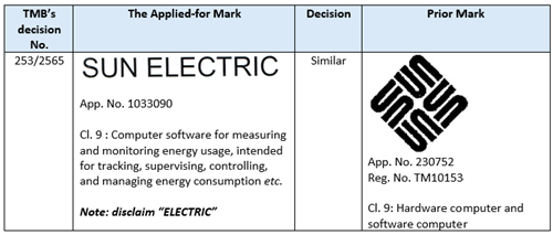 For example, in one case, the prior mark’s transliteration was indicated as “SUN.” In the applied-for mark, the word “ELECTRIC” was disclaimed, leaving “SUN” as the dominant element. As a result, the Board concluded that the marks were similar.